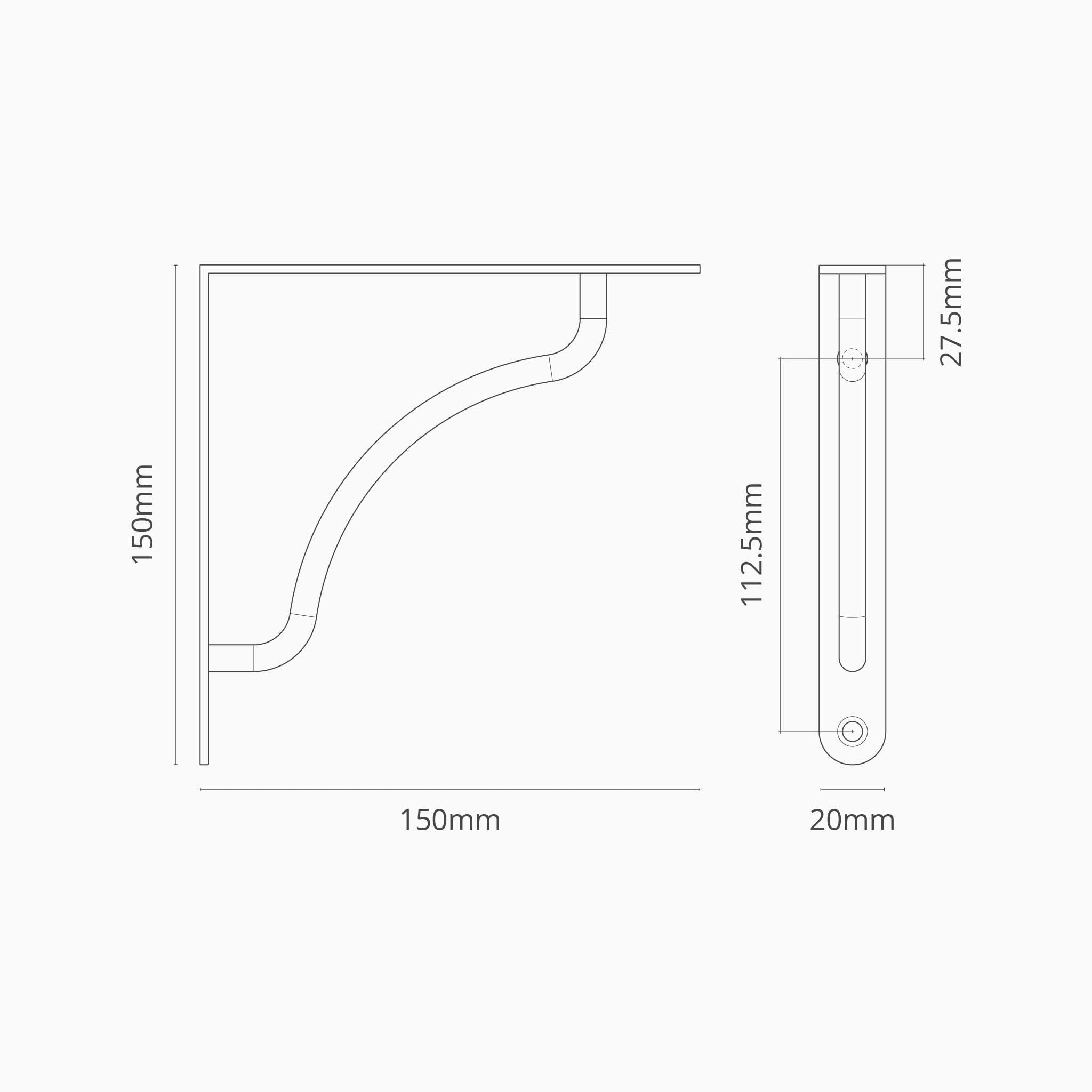 La nostra staffa per mensola Kilburn, dal profilo delicatamente curvo, è fatta di ottone solido e sostiene senza problemi 40 kg.